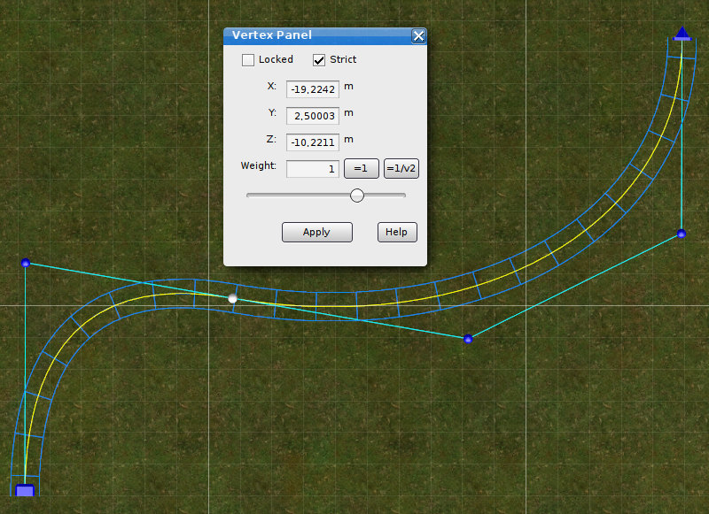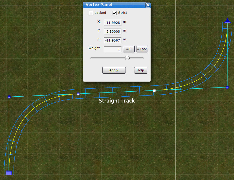 Strict vertices will force the track to go through the vertex. Strict vertices are displayed in light blue. Two following strict vertices will always create a piece of straight track in between them.